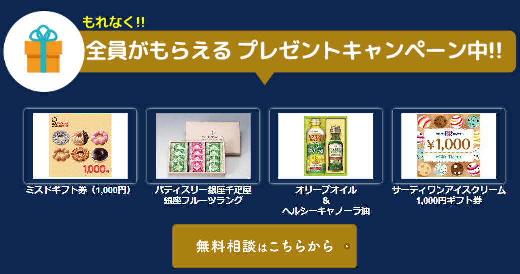 無料相談の利用で以下のプレゼントから一つ受け取ることができます。
